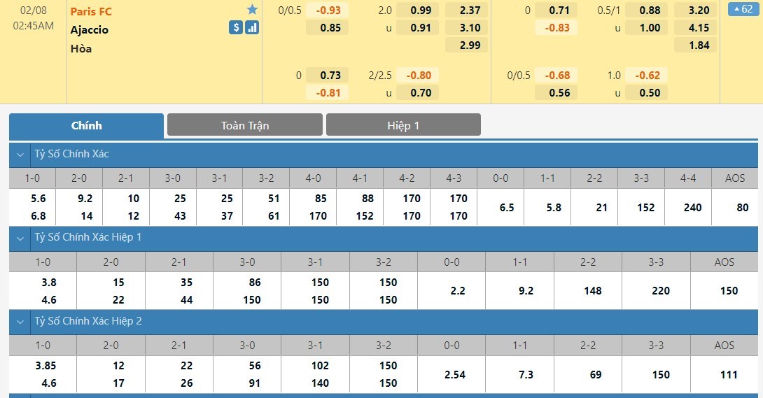 Tip kèo tỷ số hiệp 1: Paris FC 0-0 AC Ajaccio