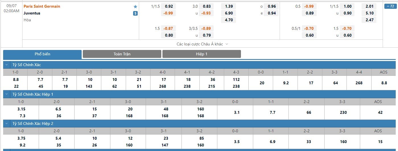 Tip kèo tỷ số hiệp 1: Paris Saint Germain 1-0 Juventus