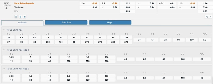 Tip kèo tỷ số hiệp 1: Paris Saint Germain 1-0 Toulouse