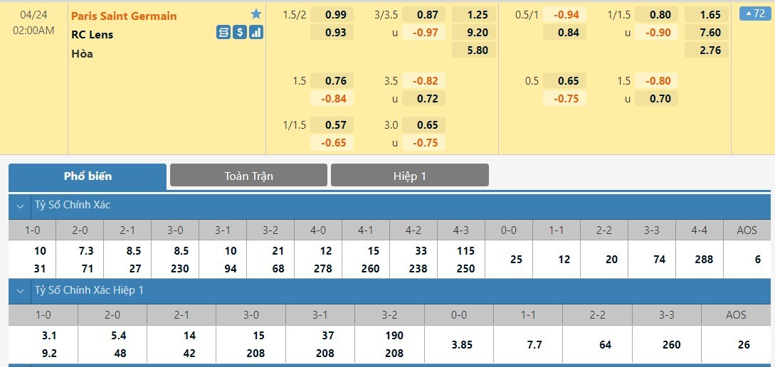Tip kèo tỷ số hiệp 1: Paris Saint-Germain 0-0 Lens