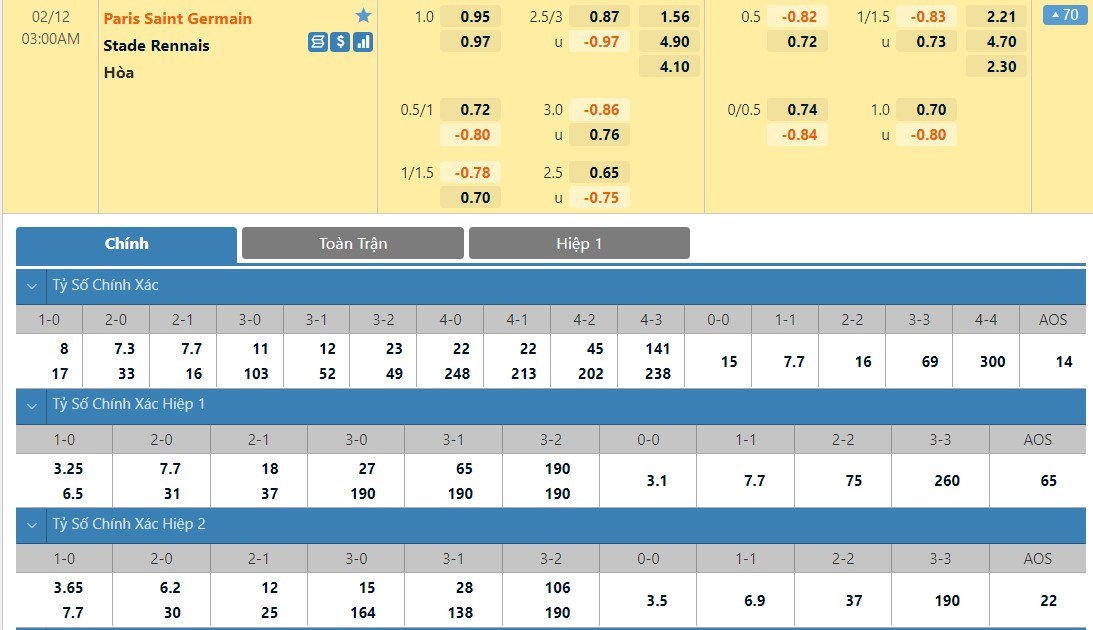 Tip kèo tỷ số hiệp 1: Paris Saint-Germain 1-0 Rennes