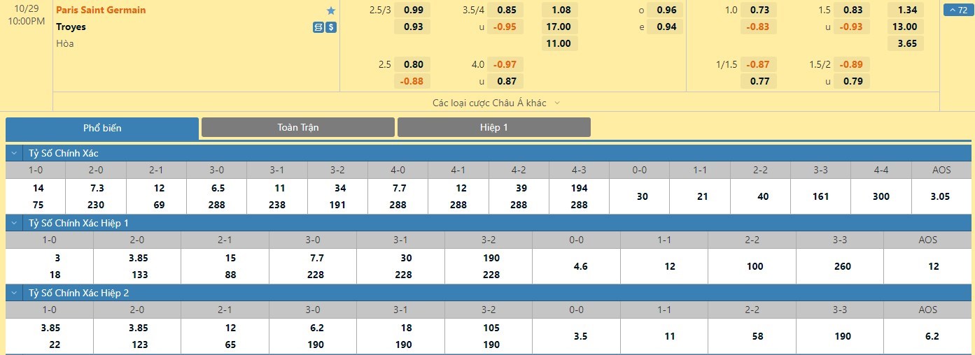 Trong 5 trận đấu gần nhất đôi bên đụng độ nhau trực tiếp, Paris Saint-Germain đã có 3 trận đấu mang về được cho mình ít nhất là 1 bàn thắng trong hiệp đấu đầu tiên. Còn với Troyes, đội bóng này đã có 2 lần làm được điều này trong 45 phút đầu tiên. Với tỷ lệ kèo hiệp 1 ở trận đấu này được đưa ra là -1 trái thì người chơi nên tin tưởng vào đội chủ nhà trận này.