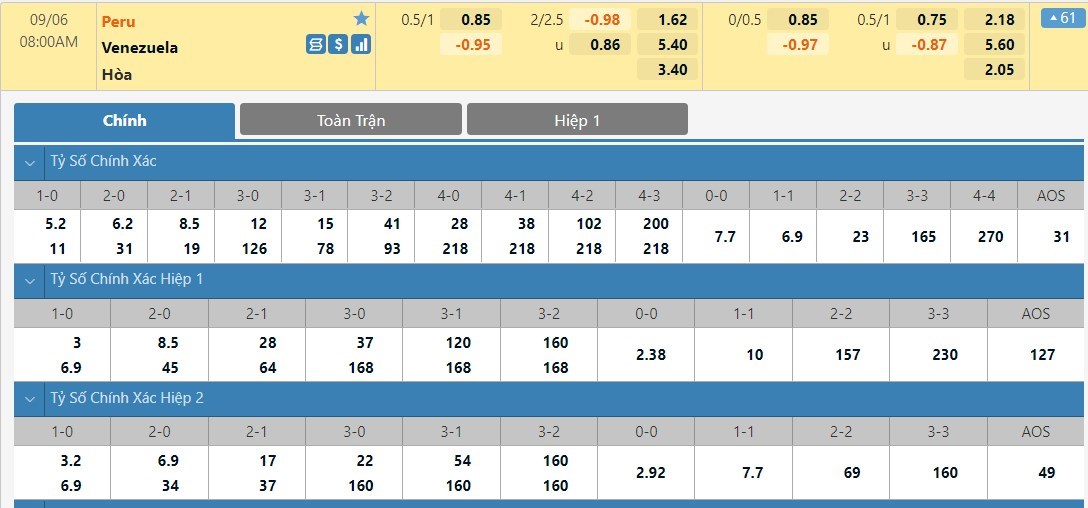 Tip kèo tỷ số hiệp 1: Peru 0-0 Venezuela