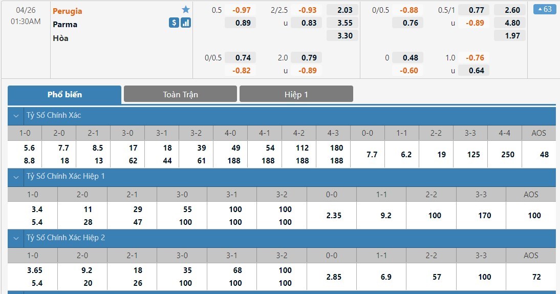 Tip kèo tỷ số hiệp 1: Perugia 0-0 Parma