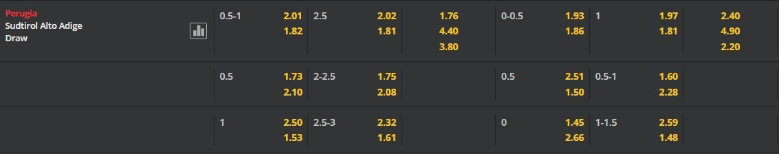 Thời điểm hiện tại Stadio Renato Curi đang trở thành pháo đài bất khả xâm phạm của các cầu thủ Perugia. Thống kê cho thấy họ đã bất bại ở 15 trận sân nhà gần nhất, hơn nữa trong số này có tới 12 chiến thắng và chỉ 3 trận hòa. Với thành tích khủng khiếp như vậy thì cơ hội cho Sudtirol đang ngày càng trở nên mong manh hơn.
