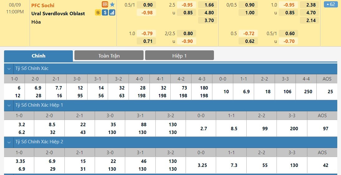 PFC Sochi là đội bóng lép vế trong những lần đối đầu Ural trước đây. Tính trong 8 cuộc đọ sức gần nhất giữa hai đội, PFC Sochi chỉ thắng 1 trận hiếm hoi, còn lại là 3 trận hòa và 4 chiến thắng thuộc về Ural. Song xét theo tình hình thực tế thì rõ ràng ở lần chạm trán sắp tới, PFC Sochi mới là những người nắm ưu thế trong tay. Bằng chứng được thể hiện ngay qua mốc chấp 3/4 trái mà nhà cái áp vào PFC Sochi ở kèo đấu này. Cả 3 cuộc đọ sức gần nhất giữa PFC Sochi và Ural đều khép lại mà không có trận nào xuất hiện trên 2 bàn thắng mỗi trận.