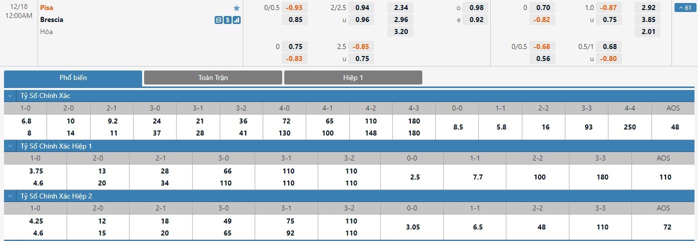 Trong 5 trận đấu gần nhất đôi bên đụng độ trực tiếp, nếu như Pisa đã có 3 trận đấu mang về được cho mình ít nhất là 1 bàn thắng trong hiệp 1 thì Brescia đã có 2 lần làm được điều này trong 45 phút đầu tiên. Với kèo hiệp 1 ở trận đấu này thì người chơi nên tin tưởng vào kịch bản hai đội sẽ chơi một cách giằng co và bước vào giờ nghỉ giải lao với tỷ số hòa.