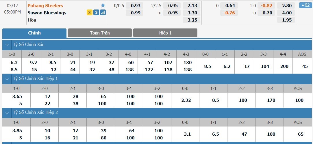 Tip kèo tỷ số hiệp 1: Pohang Steelers 0-0 Suwon Bluewings