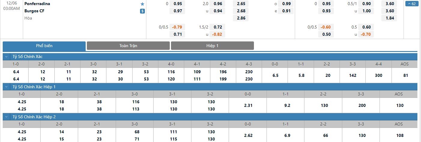 Trong 5 trận đấu gần nhất đôi bên chạm trán nhau trực tiếp, Ponferradina chỉ có 1 trận đấu mang về được cho mình ít nhất là 1 bàn thắng trong hiệp đấu đầu tiên. Còn với Burgos, đội bóng này đã có 2 lần làm được điều này trong 45 phút đầu tiên. Với tỷ lệ kèo hiệp 1 là đồng banh thì người chơi nên tin tưởng vào đội khách trận này. Khả năng cao trận đấu tới đây sẽ khó có nhiều bàn thắng. Bởi lẽ qua 4/5 trận hai đội gặp nhau gần nhất đều có tối đa 2 bàn thắng. Do đó trận này chọn Xỉu là hợp lý.