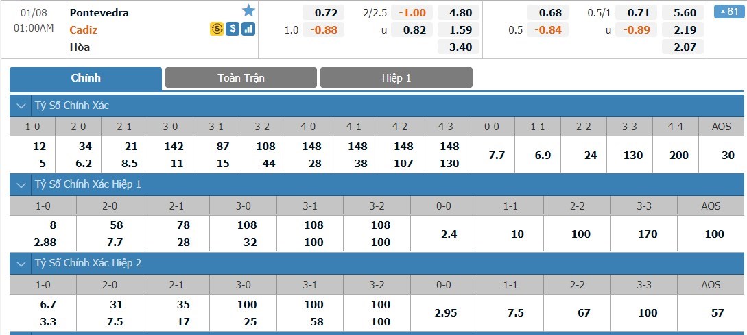 Tip kèo tỷ số hiệp 1: Pontevedra 0-1 Cadiz
