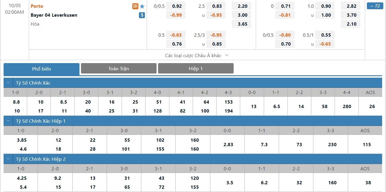 Trong 5 trận đấu gần nhất của mình, Porto đã có 2 trận đấu mang về được cho mình ít nhất là 1 bàn thắng trong hiệp đấu đầu tiên. Còn với Bayer Leverkusen, đội bóng này chỉ có 1 lần nào làm được điều này trong 45 phút đầu tiên. Với kèo hiệp 1 ở trận đấu này thì người chơi nên tin tưởng vào kết quả hòa trong 45 phút đầu tiên trận này.