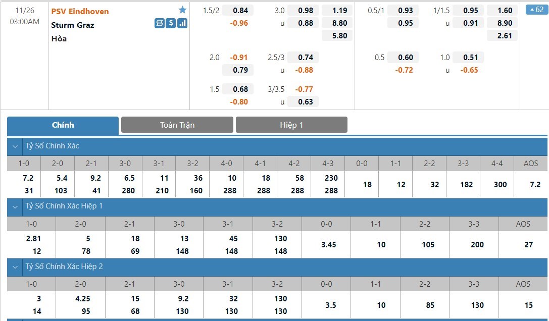 Tip kèo tỷ số hiệp 1: PSV Eindhoven 2-0 Sturm Graz