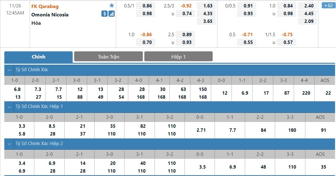Tip kèo tỷ số hiệp 1: Qarabag FK 2-0 Omonia Nicosia