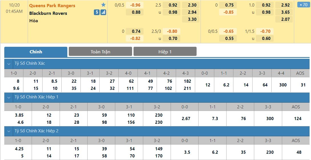 Tip kèo tỷ số hiệp 1: Queens Park Rangers 1-1 Blackburn Rovers