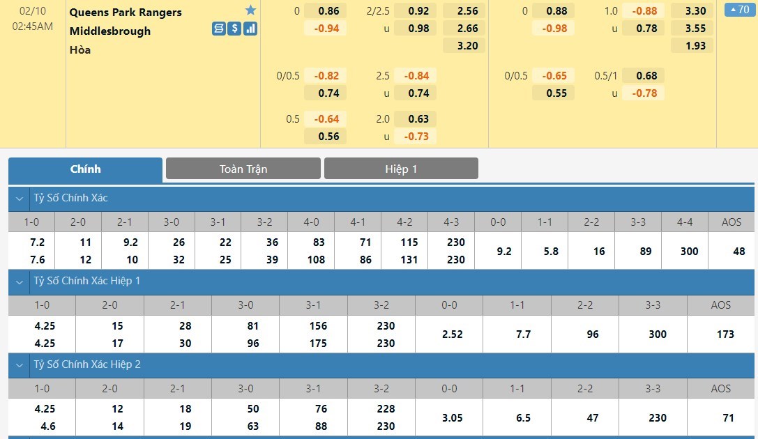 Tip kèo tỷ số hiệp 1: Queens Park Rangers 1-1 Middlesbrough