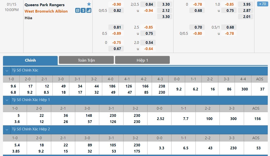 Tip kèo tỷ số hiệp 1: Queens Park Rangers 0-0 West Bromwich