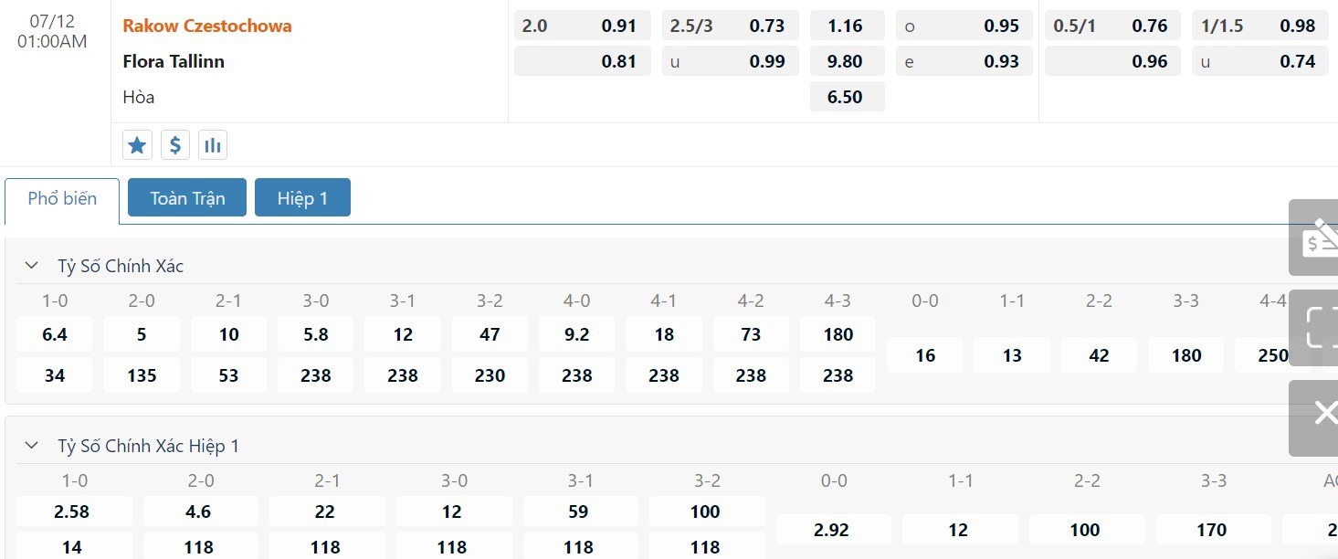 Tip kèo tỷ số hiệp 1: Rakow Czestochowa 2-0 Flora Tallinn