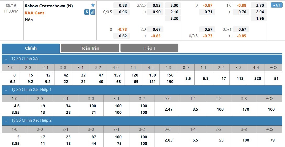 Tip kèo tỷ số hiệp 1: Rakow Czestochowa 0-1 Gent