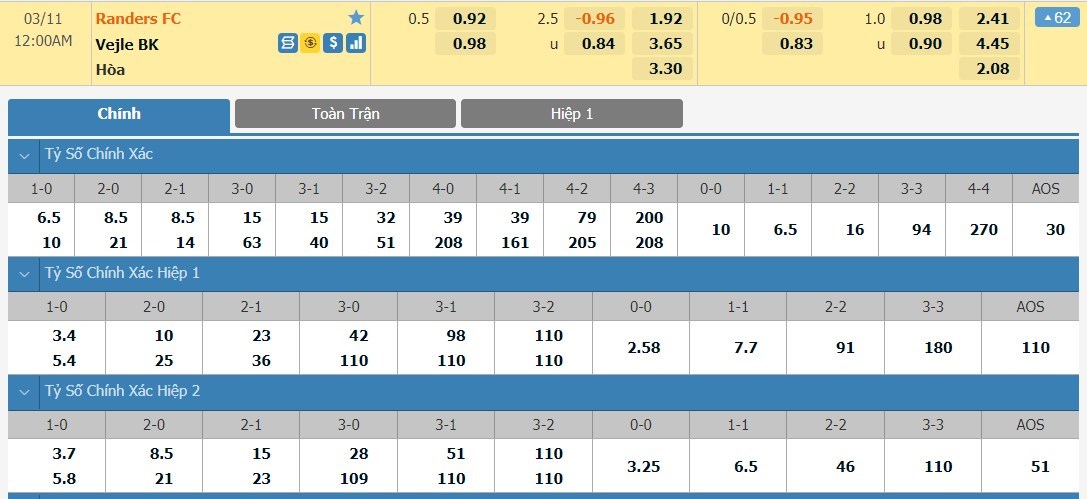 Tỷ lệ kèo chấp của trận đấu là -1/2 bàn dành cho các cầu thủ đội chủ nhà. 5 lần gần nhất làm khách trên sân của Randers FC, Vejle Boldklub chưa thể thắng khi hoà 1 và thua tới 4 trận trước đối thủ của mình. 5 trận đấu gần nhất, Randers FC dù không thắng ở 5 vòng vừa qua nhưng có tới 4 trận hoà trước các đối thủ mạnh. 5 lần gần nhất mà 2 đội bóng chạm trán với nhau có tổng cộng 10 bàn thắng được ghi mà thôi. Bên cạnh đó, 5 trận đấu gần đây nhất trên mọi đấu trường, có 3 trận đấu Randers FC không thể ghi bàn đồng thời giữ sạch lưới. Vậy nên 90 phút của cuộc đọ sức sắp tới dễ sẽ khép lại với số bàn thắng hạn chế từ 1 đến 2 bàn.