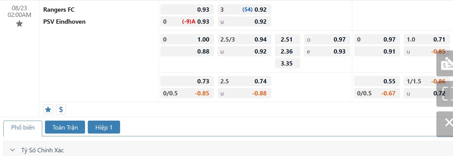 Trong 5 trận đấu gần nhất trên mọi đấu trường, Rangers đã mang về cho mình 9 pha lập công cùng với 4 lần phải vào lưới nhặt bóng. Bên kia chiến tuyến, PSV đã sở hữu 13 bàn thắng, còn lại là việc hàng thủ đã phải nhận 3 bàn thua. Các nhà đầu tư nên tin tưởng vào khả năng ra Xỉu ở cuộc đối đầu này với tỷ lệ tài xỉu là 2 3/4 trái.