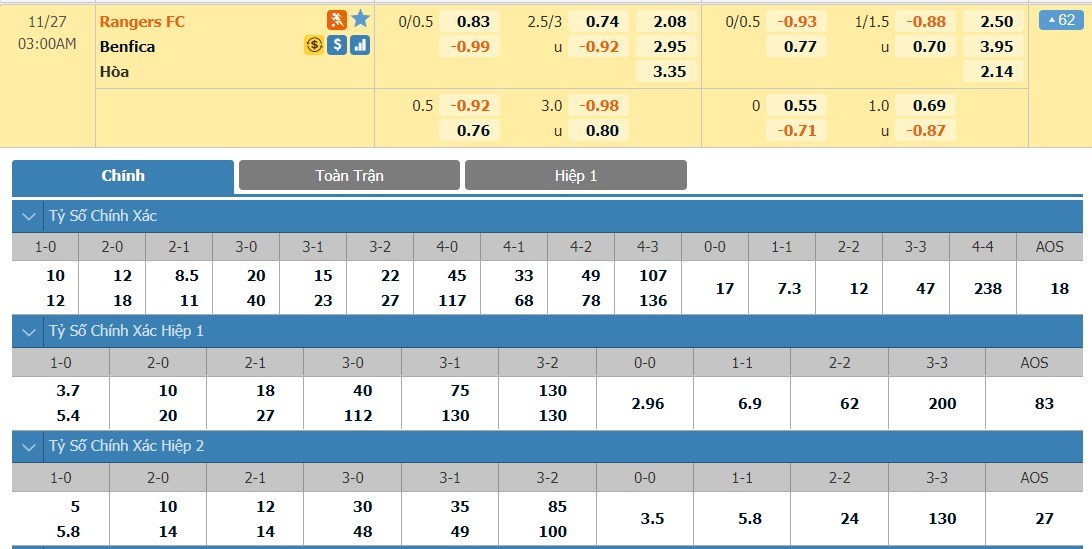 SL Benfica không có được trạng thái phong độ tốt nhất trước chuyến hành quân này. Họ đã thua 2 trận trong 4 trận đấu gần đây, chiến thắng hiếm hoi mà đội bóng này có được trong giai đoạn từ đầu tháng 11 đến nay chỉ là trận thắng tối thiểu trước đội bóng yếu Paredes tại cúp Quốc gia Bồ Đào Nha. Xét theo góc độ tỷ lệ châu Á, SL Benfica thua kèo cả 4 trận đấu kể trên. Với mốc chấp -1/4 bàn thì Rangers là ô cược sáng giá.
