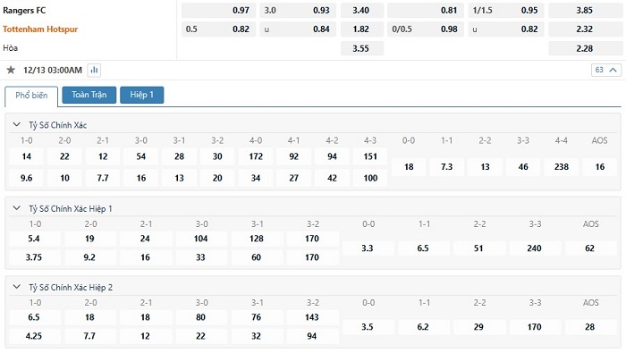 Tip kèo tỷ số hiệp 1: Rangers 1-1 Tottenham