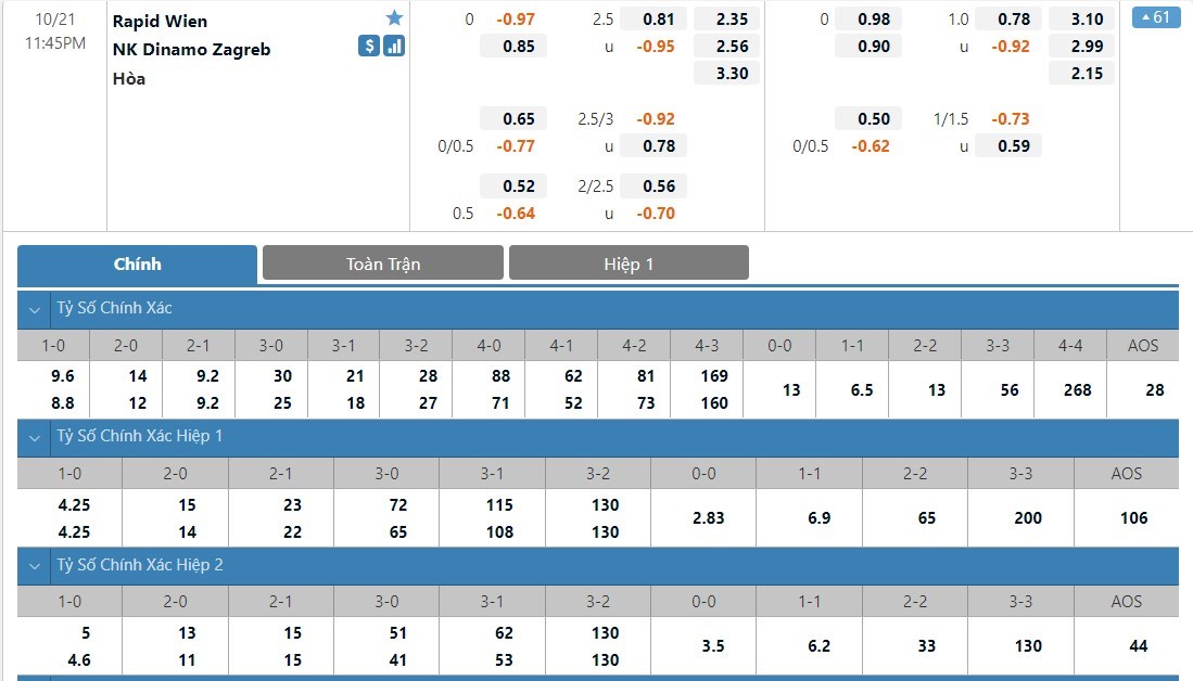Tip kèo tỷ số hiệp 1: Rapid Wien 0-0 Dinamo Zagreb