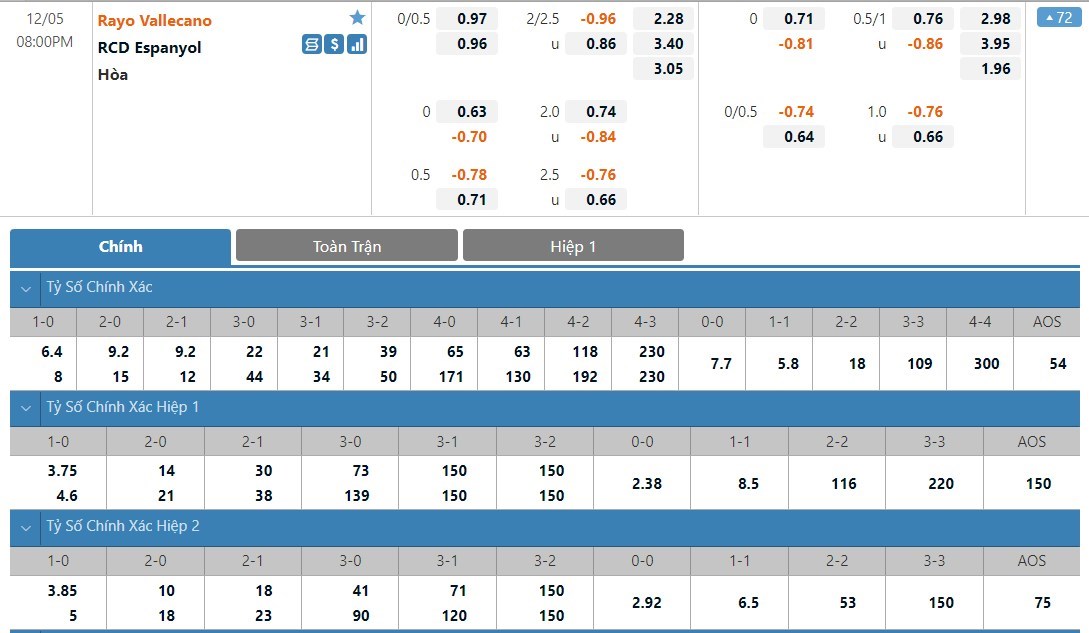 Tip kèo tỷ số hiệp 1: Rayo Vallecano 0-0 Espanyol