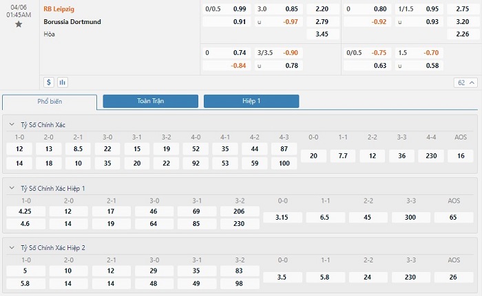 RB Leipzig với lợi thế được thi đấu trên sân nhà nhưng nhà cái cũng chỉ đưa ra mốc tỷ lệ chấp khiêm tốn -1/4 trái. Đương nhiên, Borussia Dortmund không phải là đối thủ dễ nuốt với RB Leipzig. Chính ở lần đối đầu gần nhất giữa hai đội diễn ra hồi đầu tháng 3, RB Leipzig đã để thua 1-2 trước Borussia Dortmund. Tính rộng ra, trong 10 cuộc đọ sức gần nhất giữa hai đội, ưu thế cũng nghiêng về phía đội bóng vùng Rhur. Cụ thể, RB Leipzig thắng 3, hòa 1, còn lại là 6 chiến thắng thuộc về Borussia Dortmund.