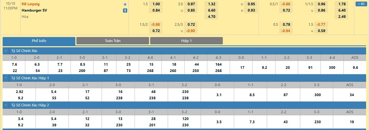 Trong 5 trận đấu gần nhất, RB Leipzig đã có 2 trận đấu mang về được cho mình ít nhất là 1 bàn thắng trong hiệp đấu đầu tiên. Còn với Hamburger, đội bóng này cũng đã có 4 lần làm được điều này trong 45 phút đầu tiên. Với tỷ lệ kèo hiệp 1 ở trận đấu này được đưa ra là -3/4 trái thì người chơi nên tin tưởng vào đội chủ nhà trận này.