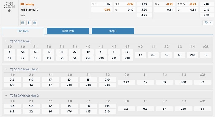 Trong 5 trận đấu gần nhất đôi bên đụng độ nhau trực tiếp, RB Leipzig đã có 3 trận đấu mang về được cho mình ít nhất là 1 bàn thắng trong hiệp đấu đầu tiên. Còn với Bochum, đội bóng này chỉ có 1 lần làm được điều này trong 45 phút đầu tiên. Với tỷ lệ kèo hiệp 1 là -1/2 trái thì người chơi nên tin tưởng vào đội chủ nhà trận này. Ở 5 lần đối đầu trực tiếp nhau thì chỉ có 1 trận đấu kết thúc với tổng số bàn thắng từ 3 trở lên. Các nhà đầu tư nên tin tưởng vào khả năng ra Xỉu ở cuộc đối đầu này với tỷ lệ tài xỉu là 3 trái.