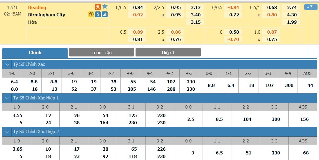 Tip kèo tỷ số hiệp 1: Reading 0-0 Birmingham
