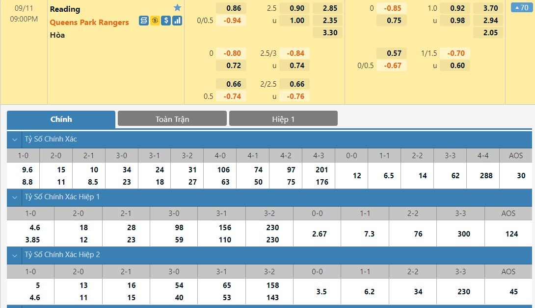 Tip kèo tỷ số hiệp 1: Reading 0-0 Queens Park Rangers