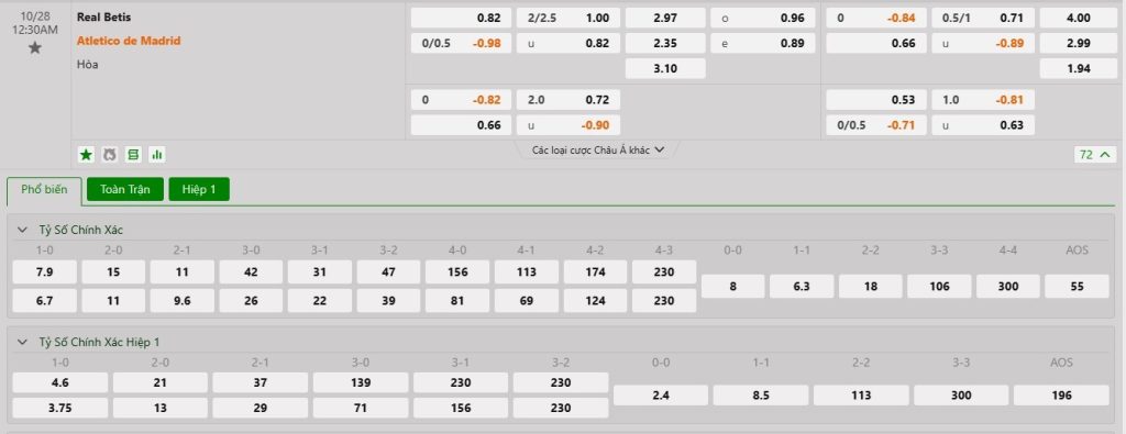 Tip kèo tỷ số hiệp 1: Real Betis 0-0 Atletico Madrid