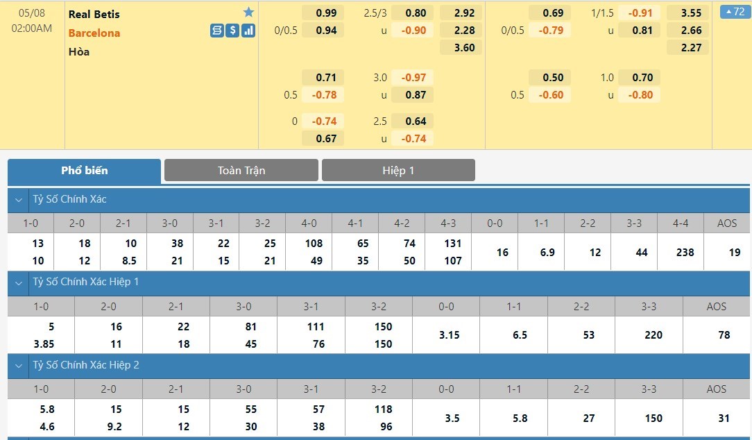 Tip kèo tỷ số hiệp 1: Real Betis 0-0 Barcelona