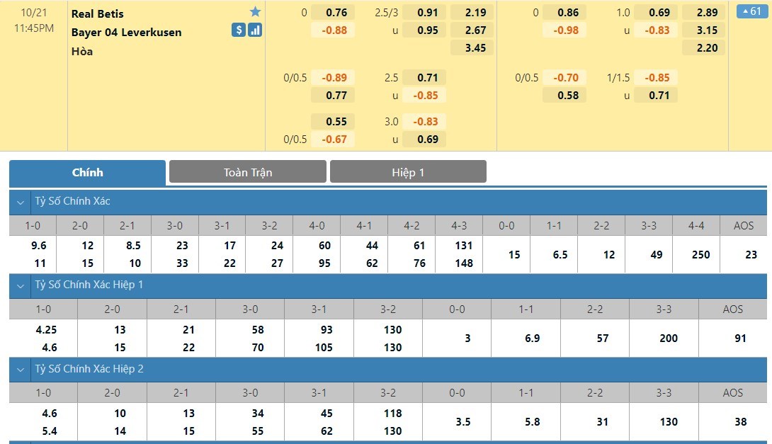 Tip kèo tỷ số hiệp 1: Real Betis 1-1 Bayer Leverkusen