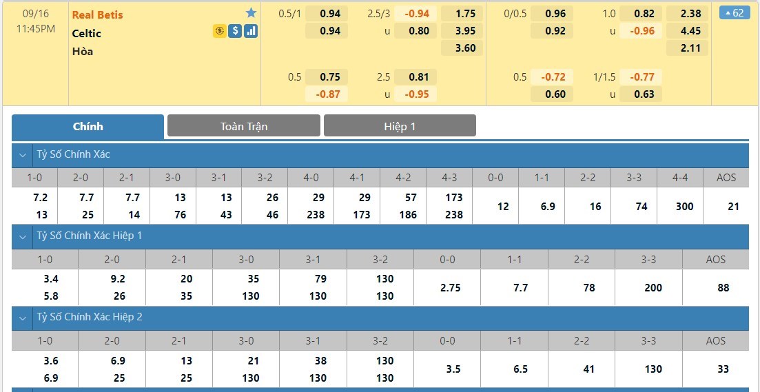 Tip kèo tỷ số hiệp 1: Real Betis 0-0 Celtic