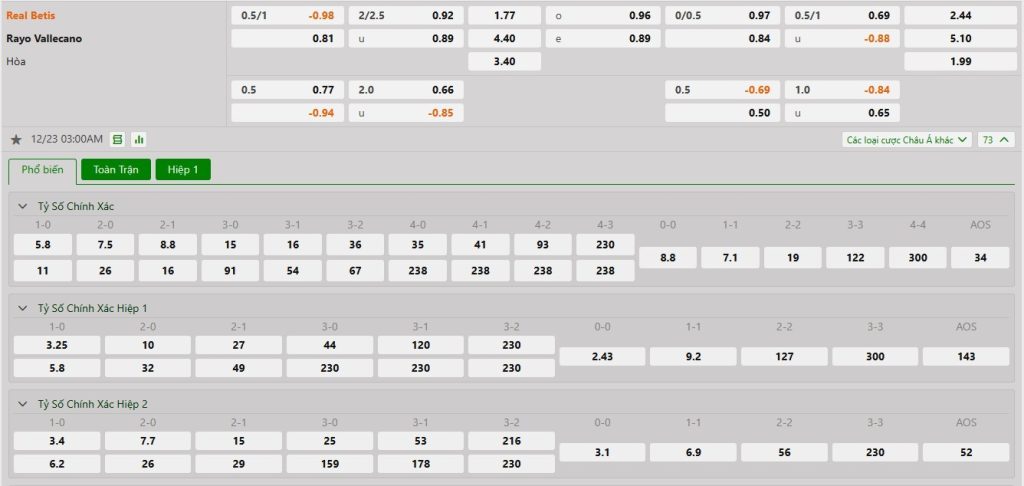 Real Betis nắm trong tay lợi thế sân nhà ở trận đấu này và họ được đội ngũ chuyên môn xếp ở thế cửa trên cùng mốc chấp -3/4 trái cũng là điều hết sức dễ hiểu. Đang đạt phong độ cao với thành tích thắng 4 trận trong 5 trận gần nhất, nếu như tiếp tục thể hiện bộ mặt thuyết phục giống như những trận đấu vừa qua thì hoàn toàn có cơ sở để tin rằng Real Betis sẽ vượt qua được chướng ngại vật mang tên Rayo Vallecano. Song như đã đề cập thì Rayo Vallecano đang có những màn trình diễn đáng gờm trong thời gian qua và họ cũng sẽ mang tới những trở ngại nhất định cho Real Betis. Lịch sử đối đầu đang đứng về phía Real Betis khi mà họ thắng 3/4 lần gần nhất gặp mặt Rayo Vallecano. Riêng trong cả 2 lần gần nhất ghé thăm sân nhà của Betis thì Rayo Vallecano đều phải nhận kết cục tay trắng ra về.