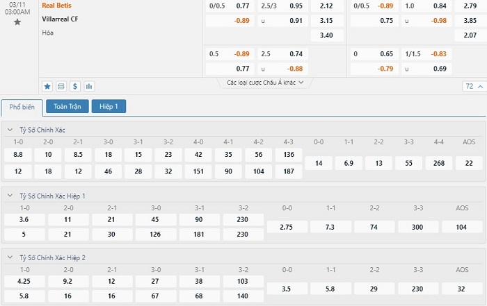 Tip kèo tỷ số hiệp 1: Real Betis 0-0 Villarreal