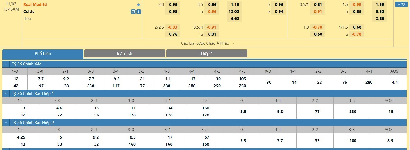 Trong 5 trận đấu gần nhất, Real Madrid đã có 4 trận đấu mang về được cho mình ít nhất là 1 bàn thắng trong hiệp đấu đầu tiên. Còn với Celtic, đội bóng này đã có 4 lần làm được điều này trong 45 phút đầu tiên. Với tỷ lệ kèo hiệp 1 ở trận đấu này được đưa ra là Real Madrid chấp sâu tỷ lệ -3/4 trái thì người chơi nên tin tưởng vào đội chủ nhà trận này.