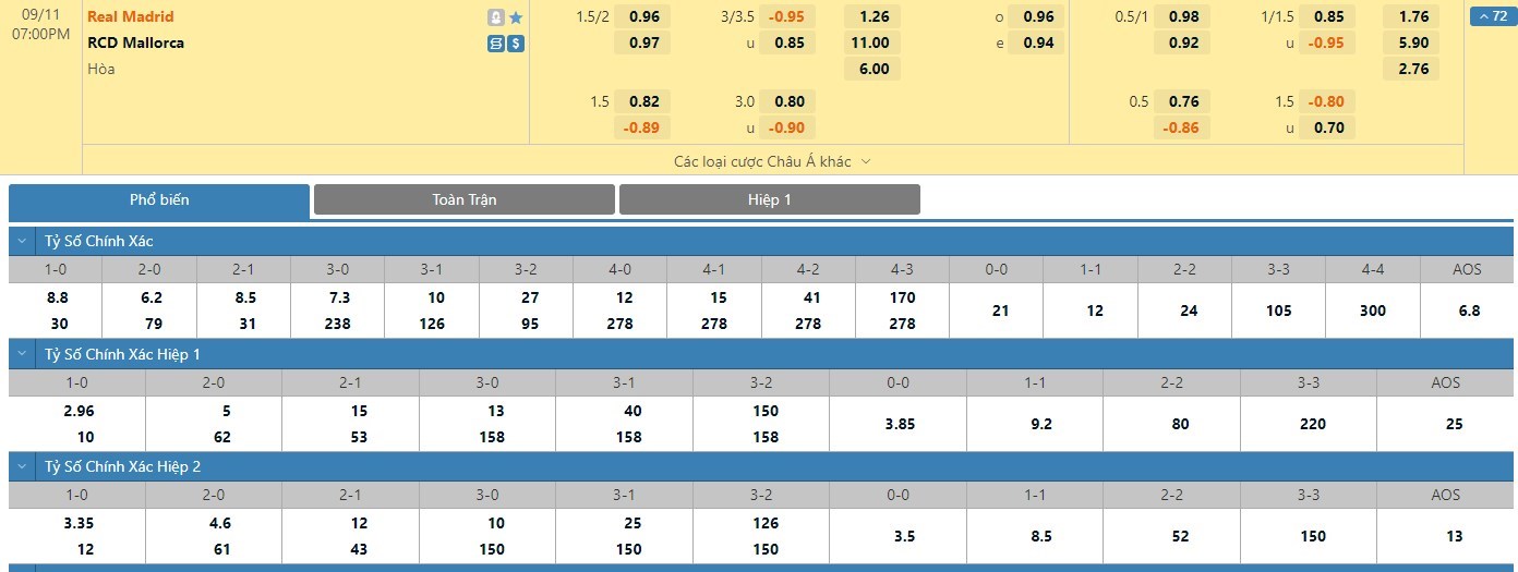 Trong 5 trận đấu gần nhất, nếu như Real Madrid đã có 3 trận đấu mang về được cho mình ít nhất là 1 bàn thắng trong hiệp đấu đầu tiên thì Mallorca chỉ có 1 lần làm được điều đó. Với tỷ lệ kèo hiệp 1 ở trận đấu này được đưa ra là -3/4 trái thì người chơi nên tin tưởng vào đội chủ nhà trận này.