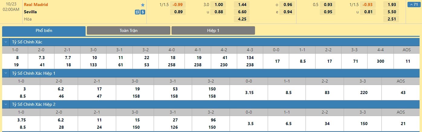 Trong 5 trận đấu gần nhất hai đội đụng độ nhau trực tiếp, Real Madrid chỉ có 1 trận đấu mang về được cho mình ít nhất là 1 bàn thắng trong hiệp đấu đầu tiên trong khi Sevilla đã có 3 lần làm được điều này. Tỷ lệ kèo hiệp 1 ở trận đấu này được đưa ra là -1/2 trái và người chơi nên tin tưởng vào đội chủ nhà.