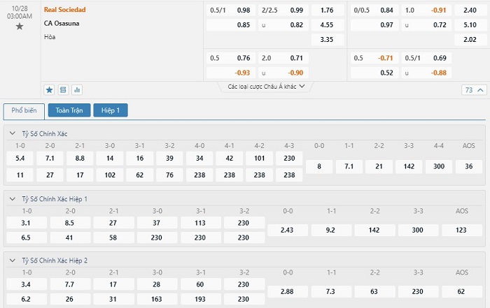 Tip kèo tỷ số hiệp 1: Real Sociedad 0-0 Osasuna