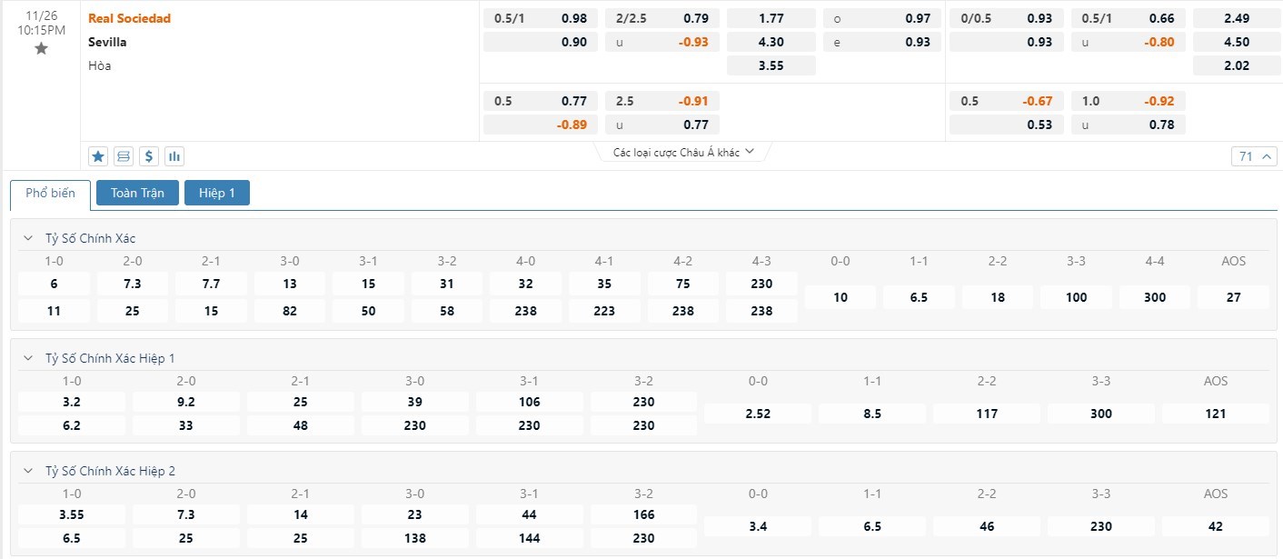 Tip kèo tỷ số hiệp 1: Real Sociedad 1-0 Sevilla