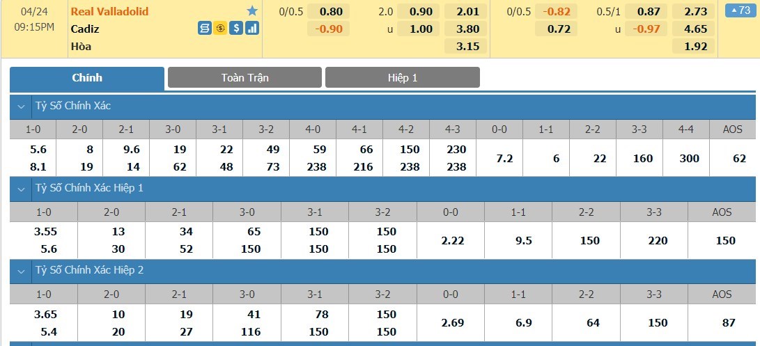 Tip kèo tỷ số hiệp 1:Real Valladolid 0-0 Cadiz