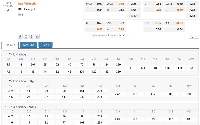 Tip kèo tỷ số hiệp 1: Real Valladolid 0-0 Espanyol