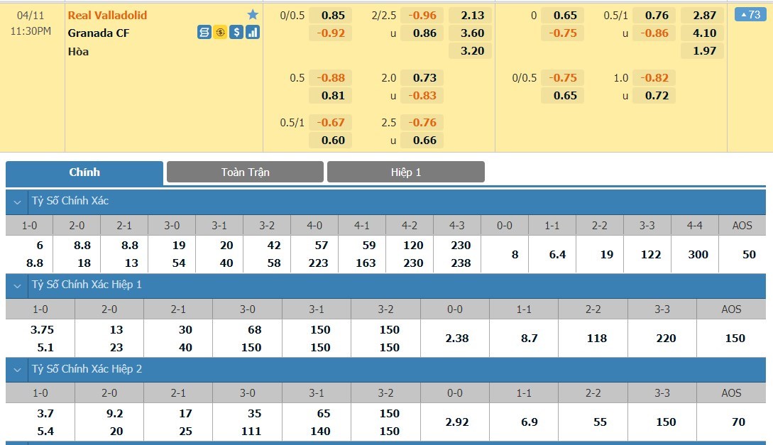 Tip kèo tỷ số hiệp 1: Real Valladolid 0-0 Granada