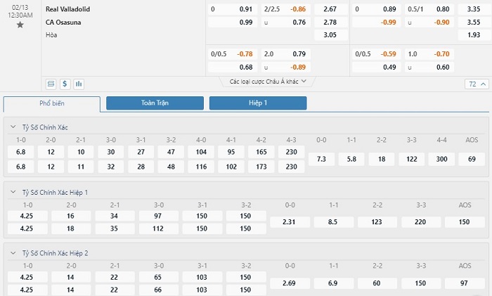Tip kèo tỷ số hiệp 1: Real Valladolid 0-0 Osasuna