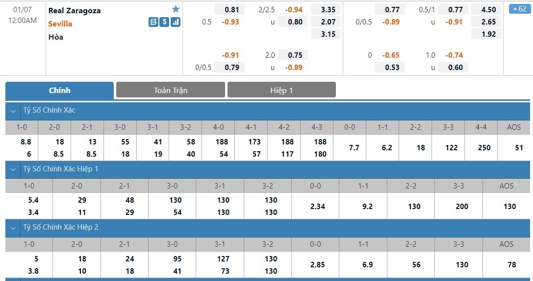 Tip kèo tỷ số hiệp 1: Real Zaragoza 0-1 Sevilla