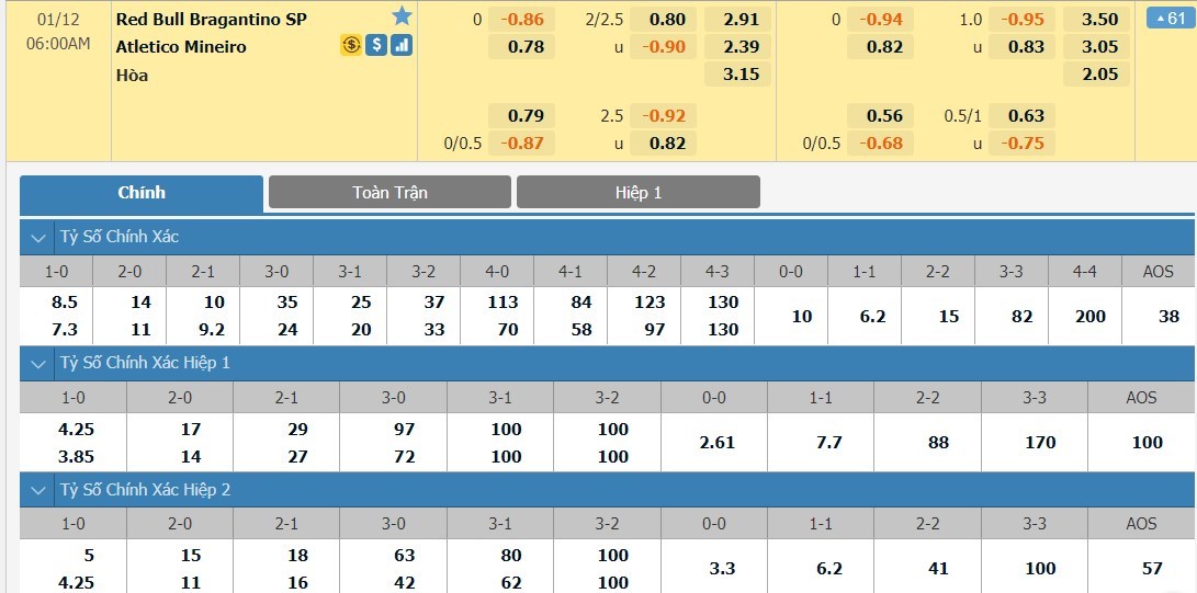 Tip kèo tỷ số hiệp 1: Red Bull Bragantino 0-0 Atletico MG